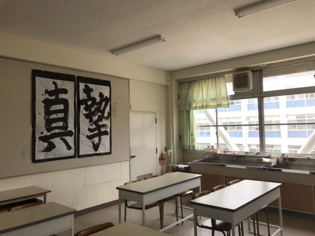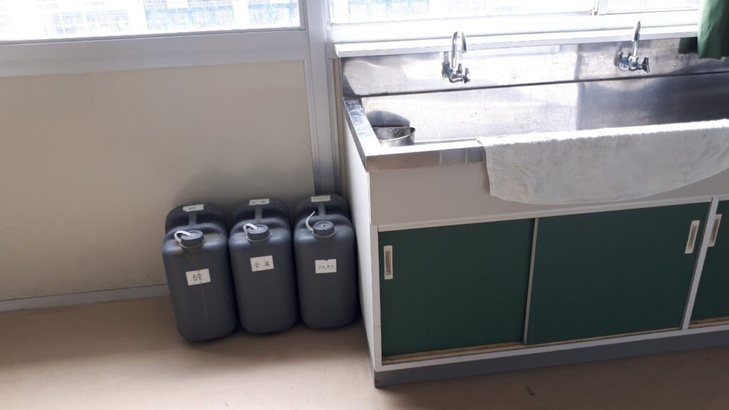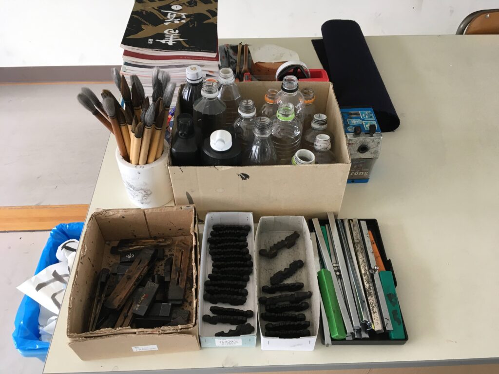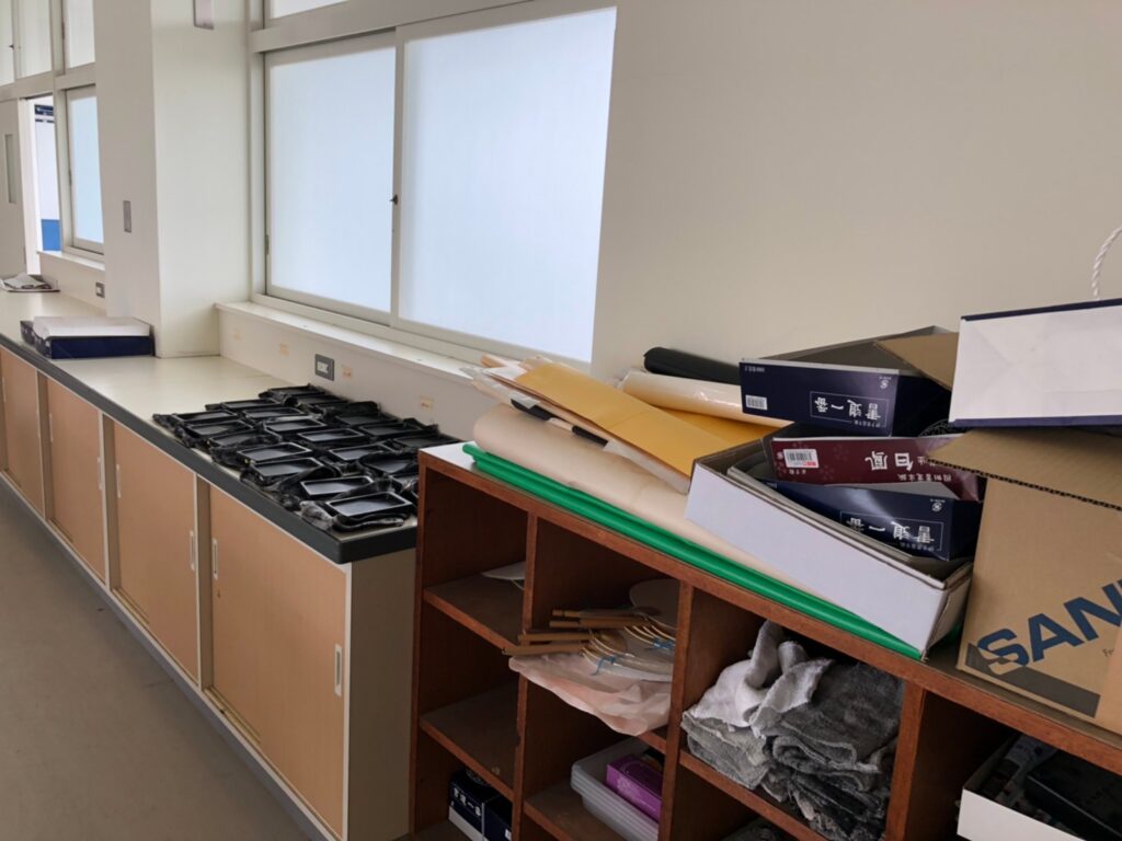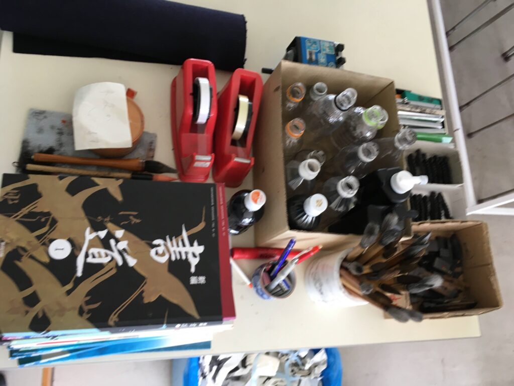 書道専用デスク、ステンレスの流し台がたくさんあり、